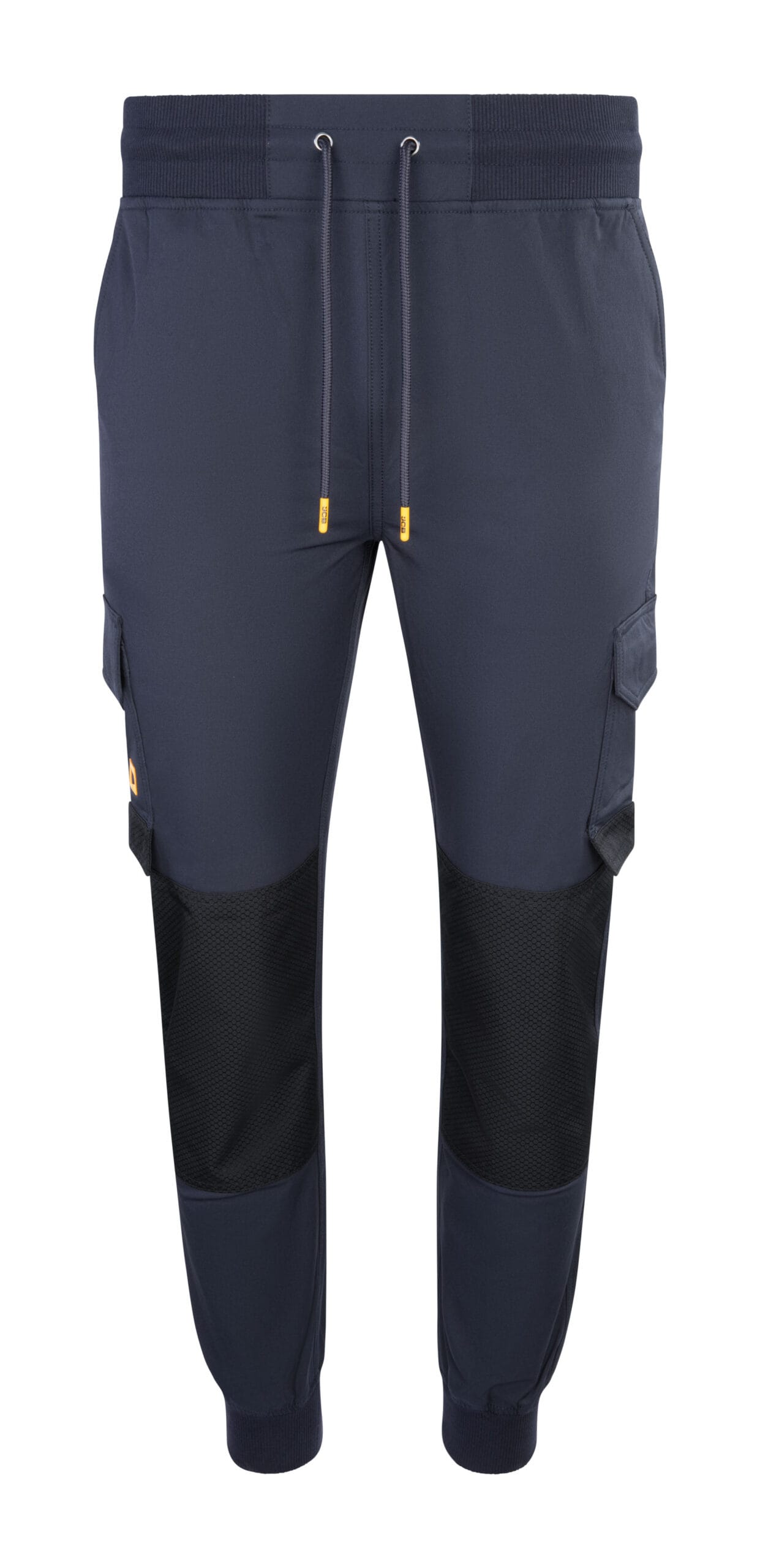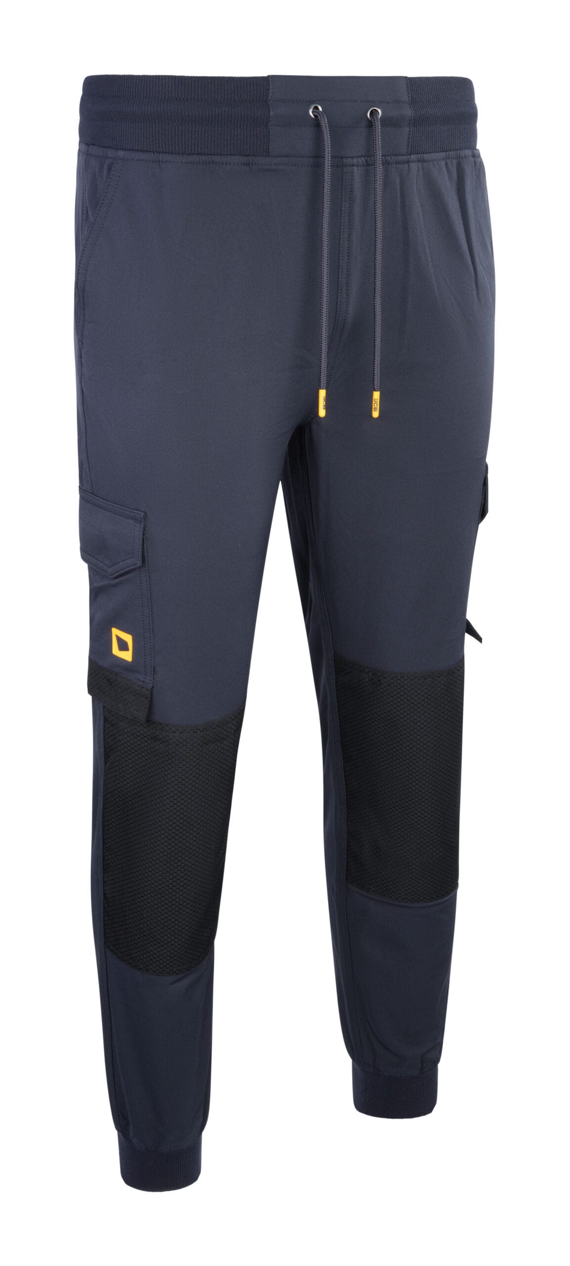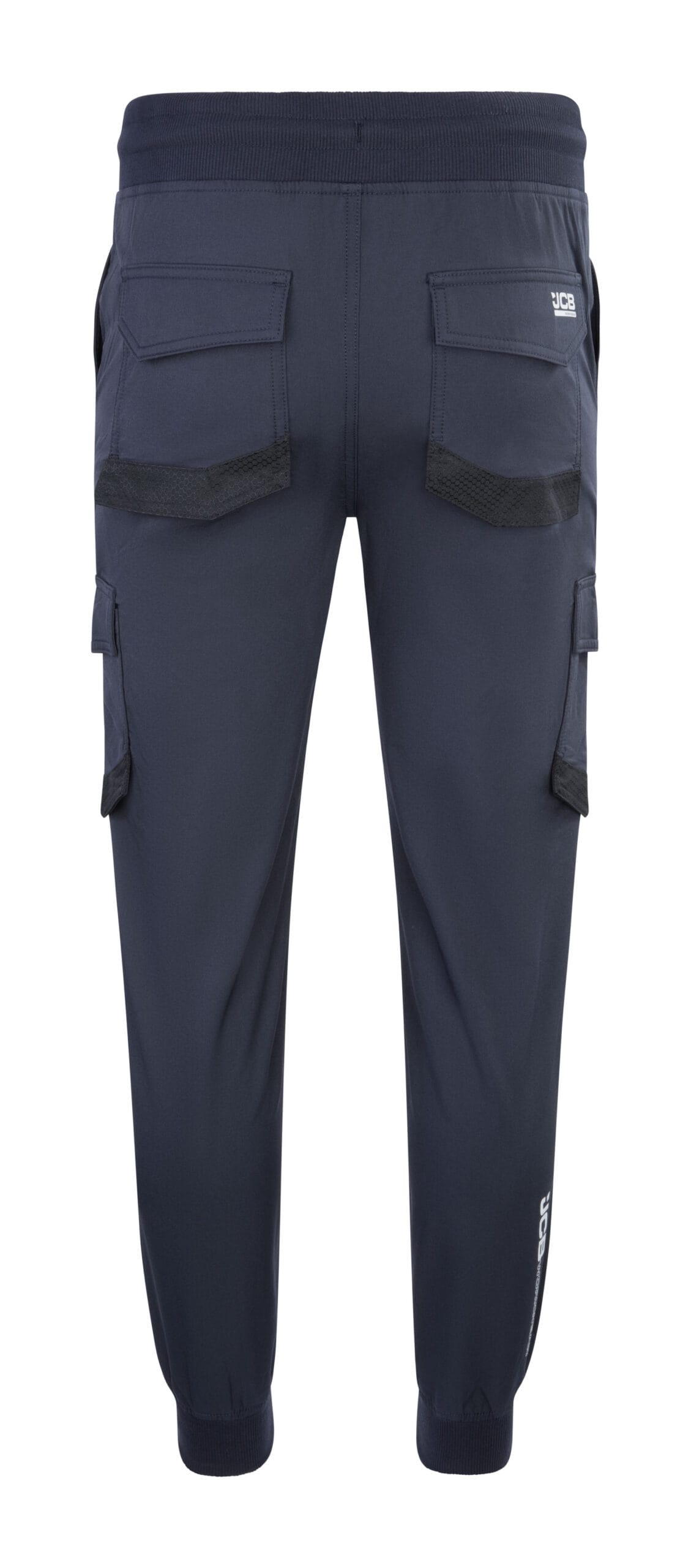 Durable 210g nylon-spandex 4-way stretch fabric (92% nylon / 8% spandex) for flexibility and strength > Heavy-duty abrasion resistance tested to 100,000 cycles on reinforced pockets and hems > Elasticated waistband and ankle cuffs for secure, comfortable fit > Practical cargo pockets and reinforced pockets for on-site functionality > Water-repellent finish helps protect against light rain and spills > Finished with a silicone tab on pocket for authentic JCB branding