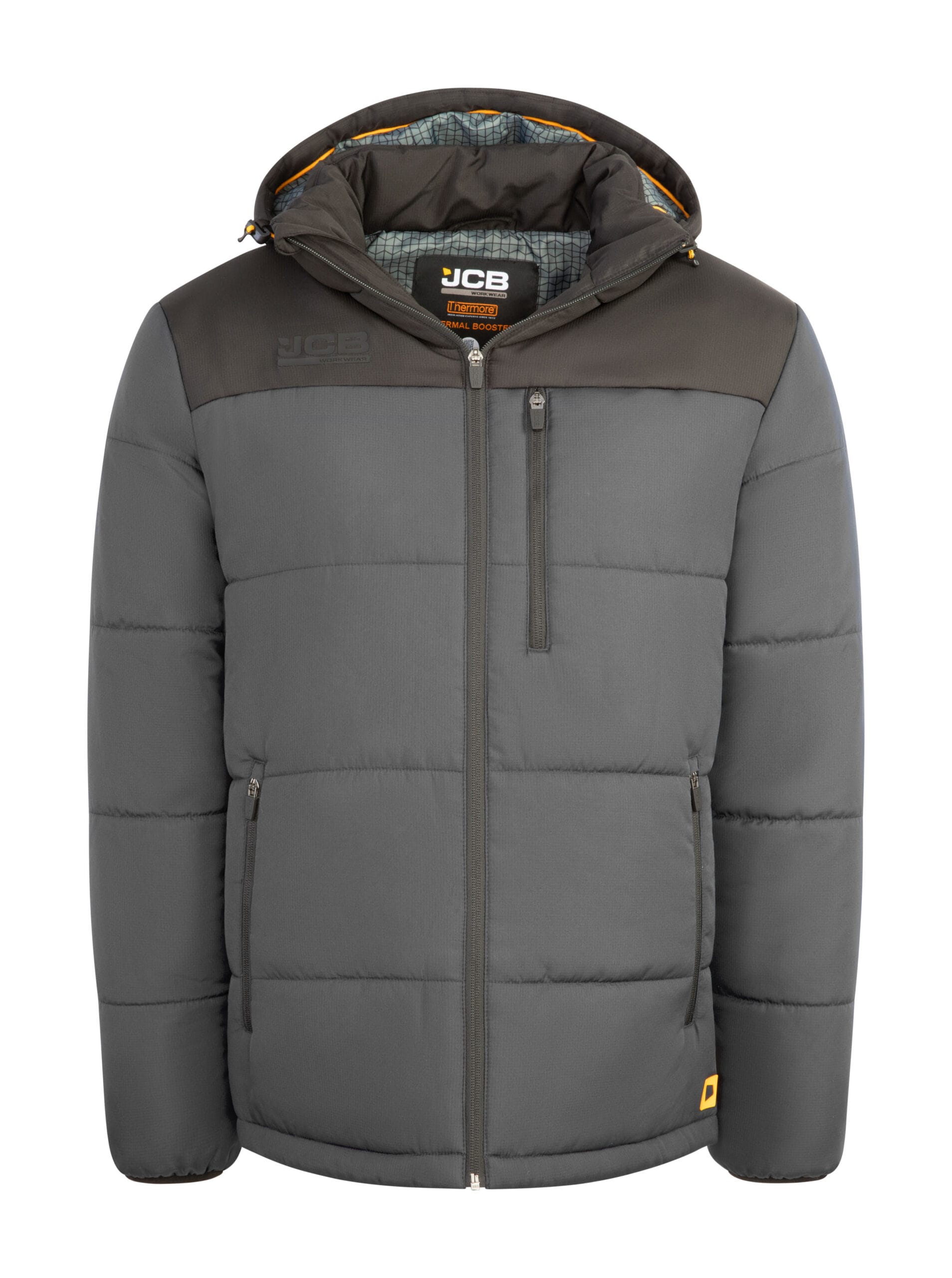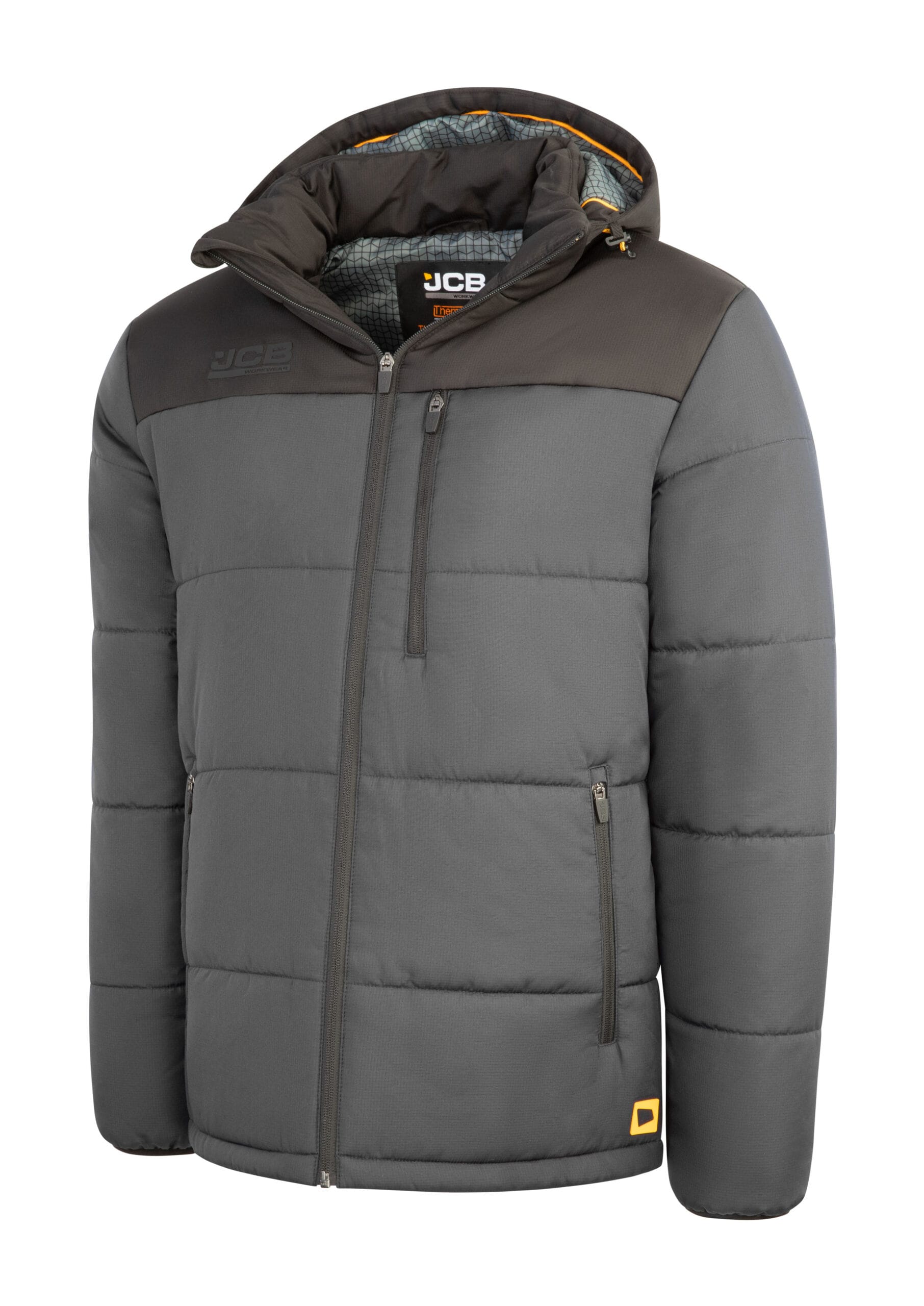 Durable 100% polyester ripstop outer fabric (85g) for lightweight strength and tear resistance > 160g soft wadding insulation provides warmth without excessive bulk > Durable water-repellent finish helps protect against light rain and moisture > Fixed Nordic-style hood offers added protection in colder conditions > Practical left breast pocket for secure storage > Printed lining adds comfort and a premium finish > Finished with a silicone tab on the hem for subtle JCB branding